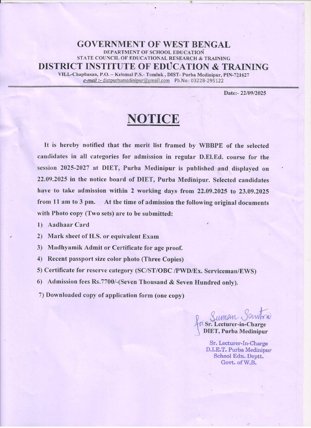 ADMISSION NOTICE AND 1ST MERIT LIST FOR D.El.Ed. COURSE OF SESSION 2025-27